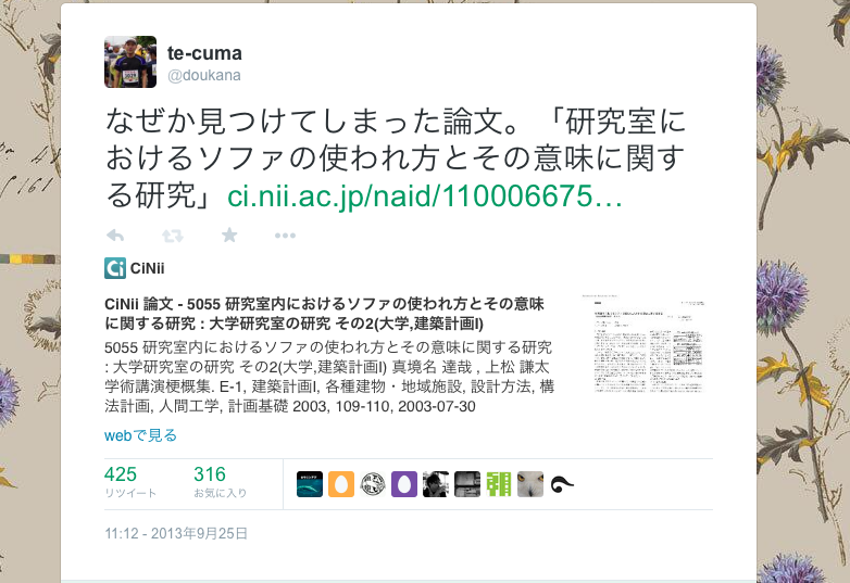 - ソファ(なかったので欲しかったけど、泊まりこむことなどないので、なければないでかまわないでしょう)→内々定が出た直後に、研究室におけるソファについて調べていたら、面白い論文を見つけました。 当時のツイート