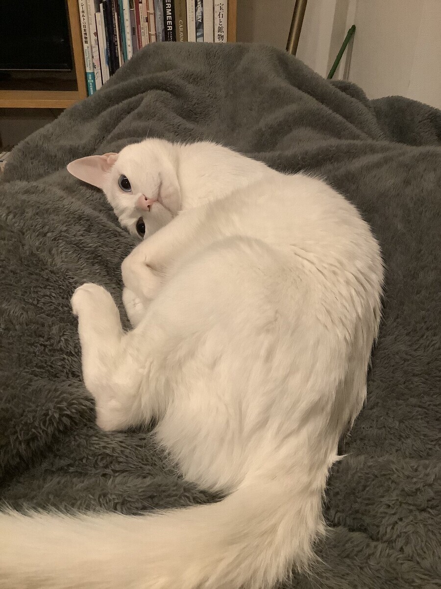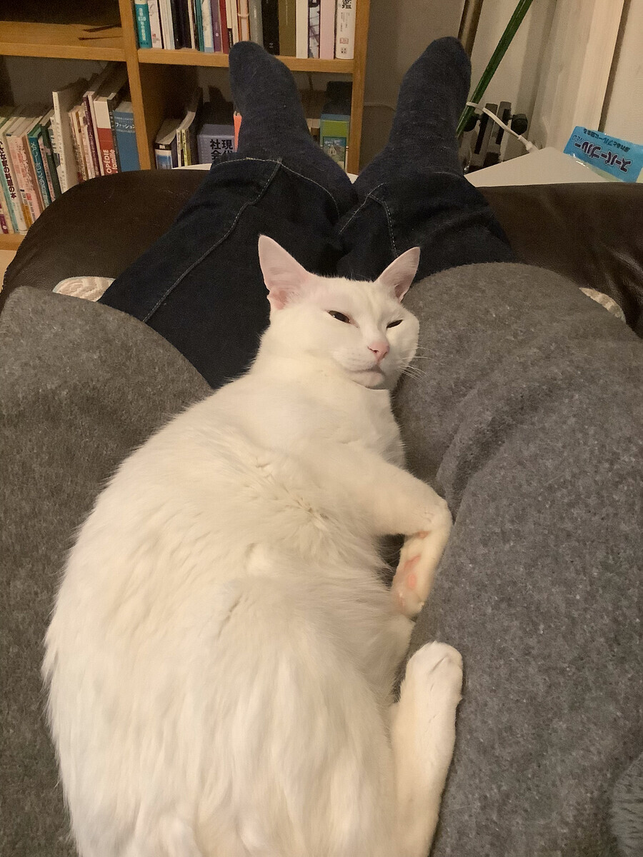 寒い日は脚の上に乗るだけでなく、毛布にくるまって眠ることもあるし、暑い日ならば、脚の上にそのまま乗っかってくつろぎます。