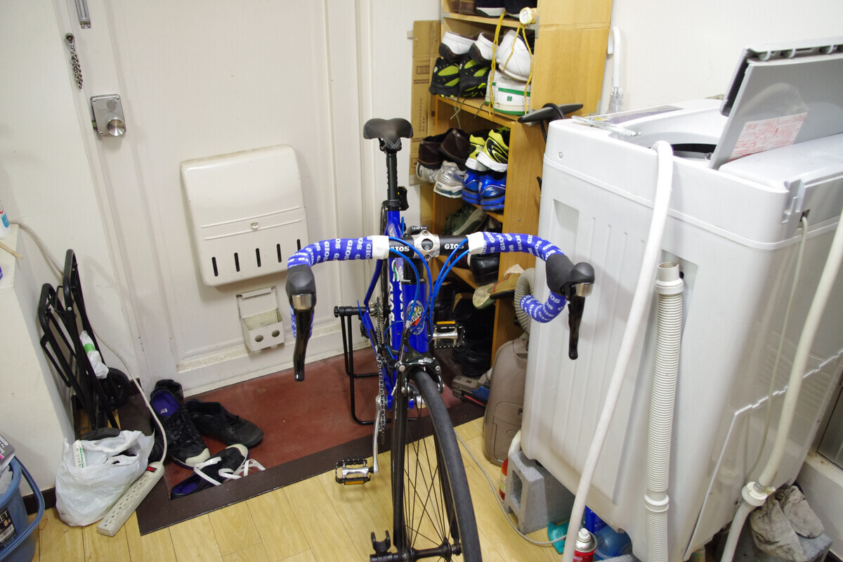 玄関には靴箱、ロードバイクと共に洗濯機をおいていました。洗濯機の下にブロックを置いて高さを稼いでいるのがわかります。排水ホースは普段は本体横にくっつけておき、使用時のみお風呂場のほうに伸ばしていました。
