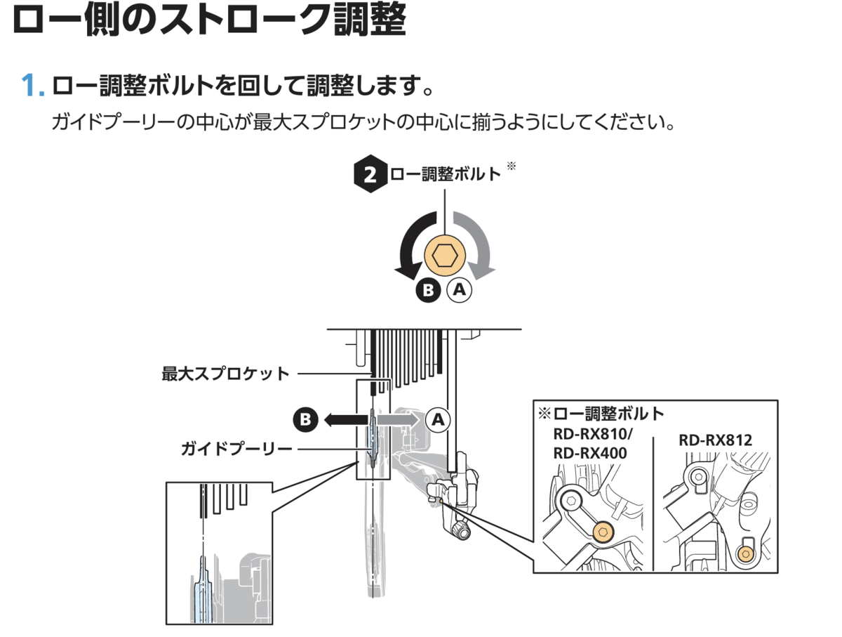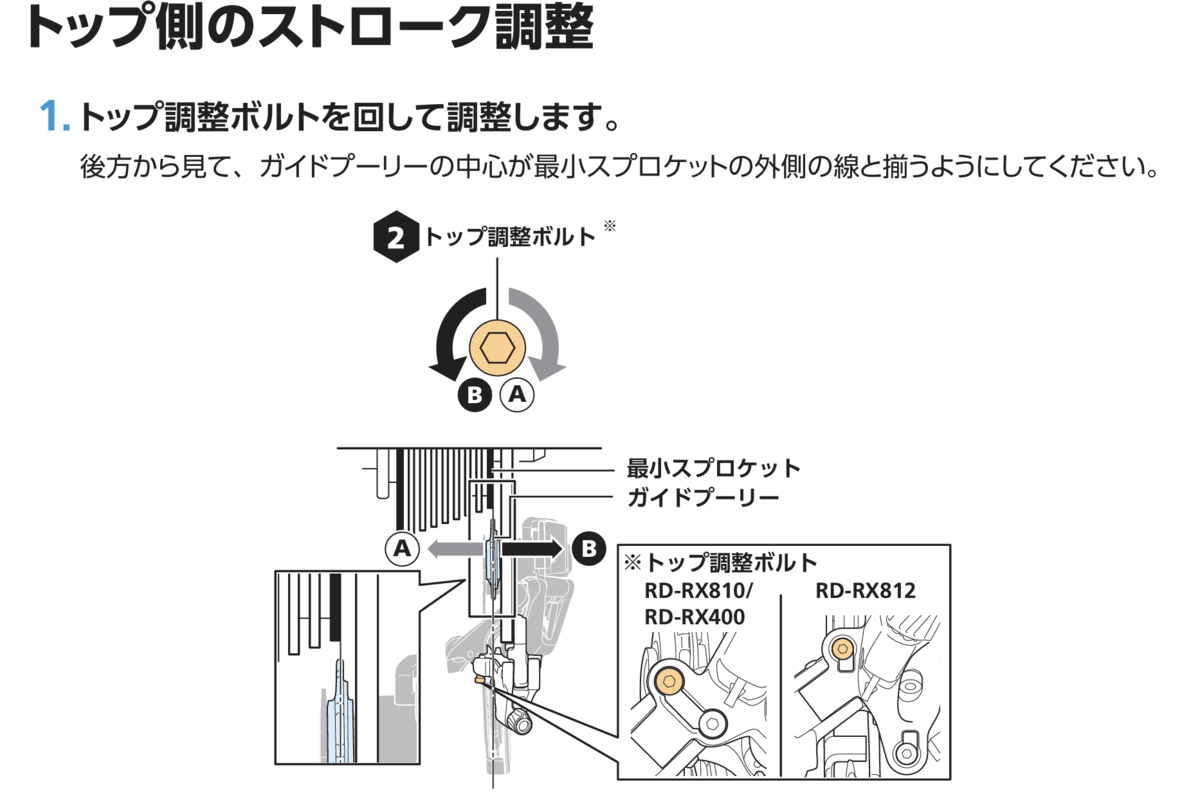 ・トップ/ロー調整ボルトの回転方向はすぐわからなくなるのでよく見て確認する。